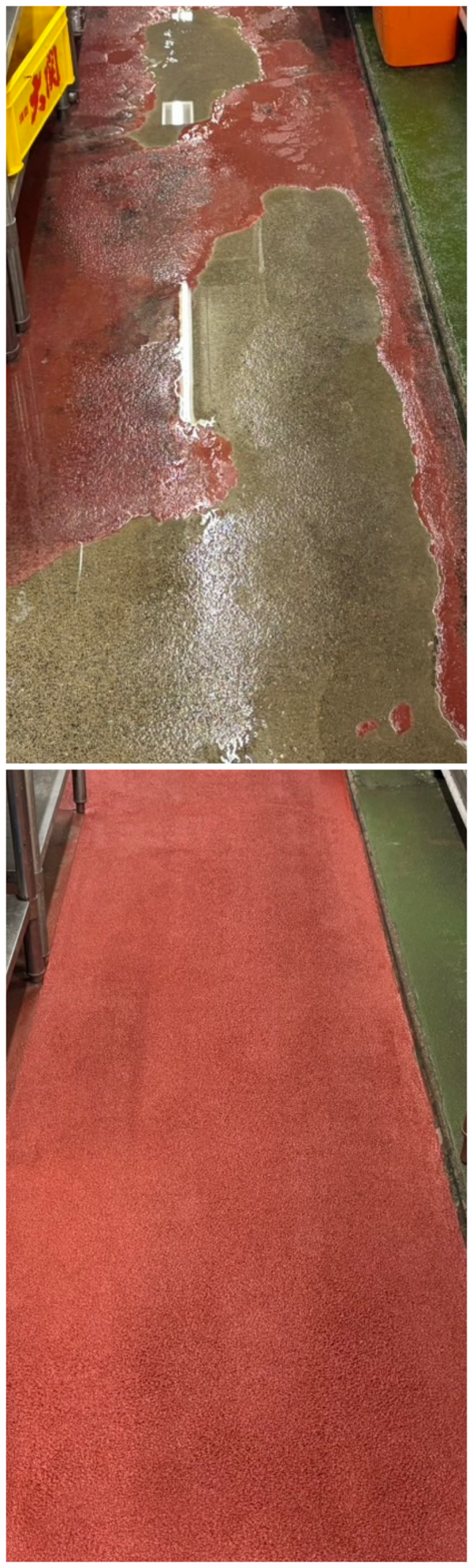 水、油汚れも溜まってしまい滑りやすく転倒の危険性が高いため改善を希望。